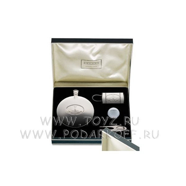 Подарочный набор для гольфа. В набор входит: фляга 196 мл, комбинированная со складным стаканчиком (артикул 00437); персональная бирка (артикул 00405); вилка для восстановления газона; мячик для профессионального гольфа.